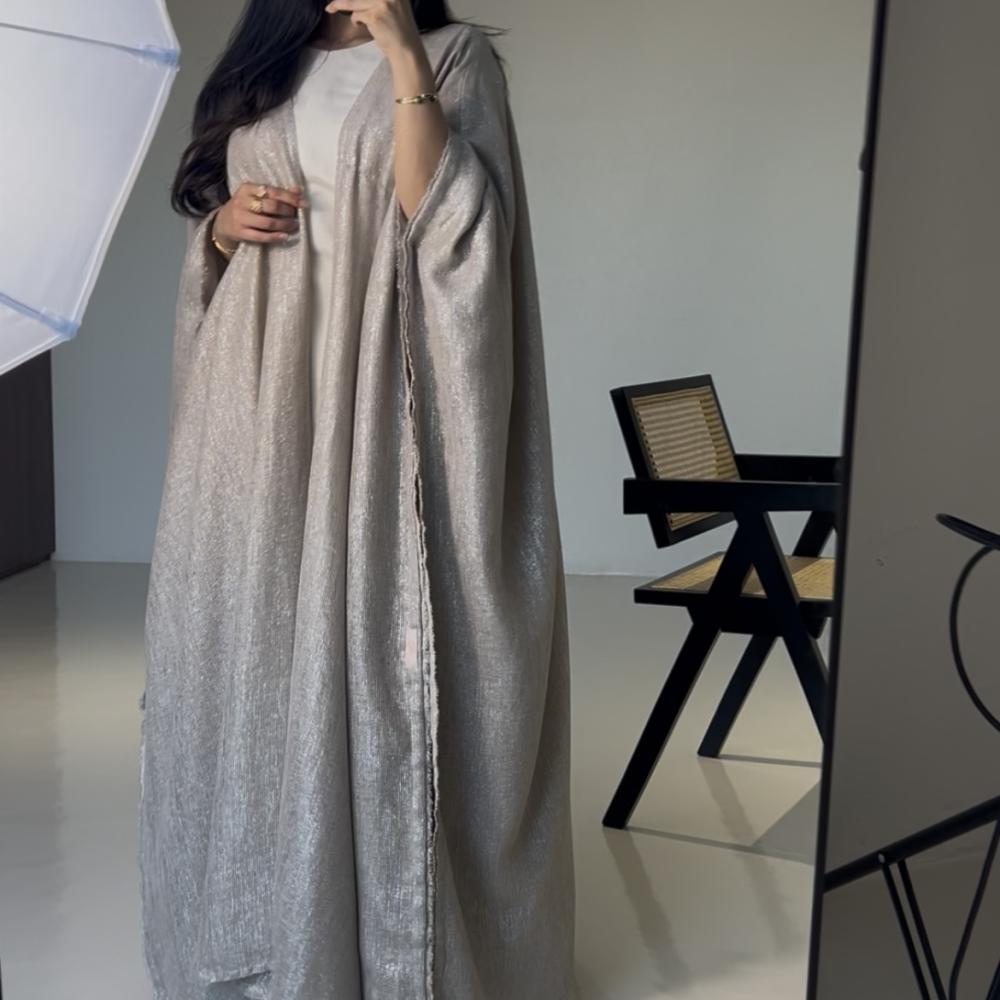 تميزي بعباية صيفية أنيقة بشت مفتوحة من الجوانب بقماش خيش لمعه باللون الذهبي والفضي مرفق طرحة مع العباية من القماش الياباني الناعم ، عباية صيفية انيقة و مريحة ومناسبة لجميع الأوقات ..