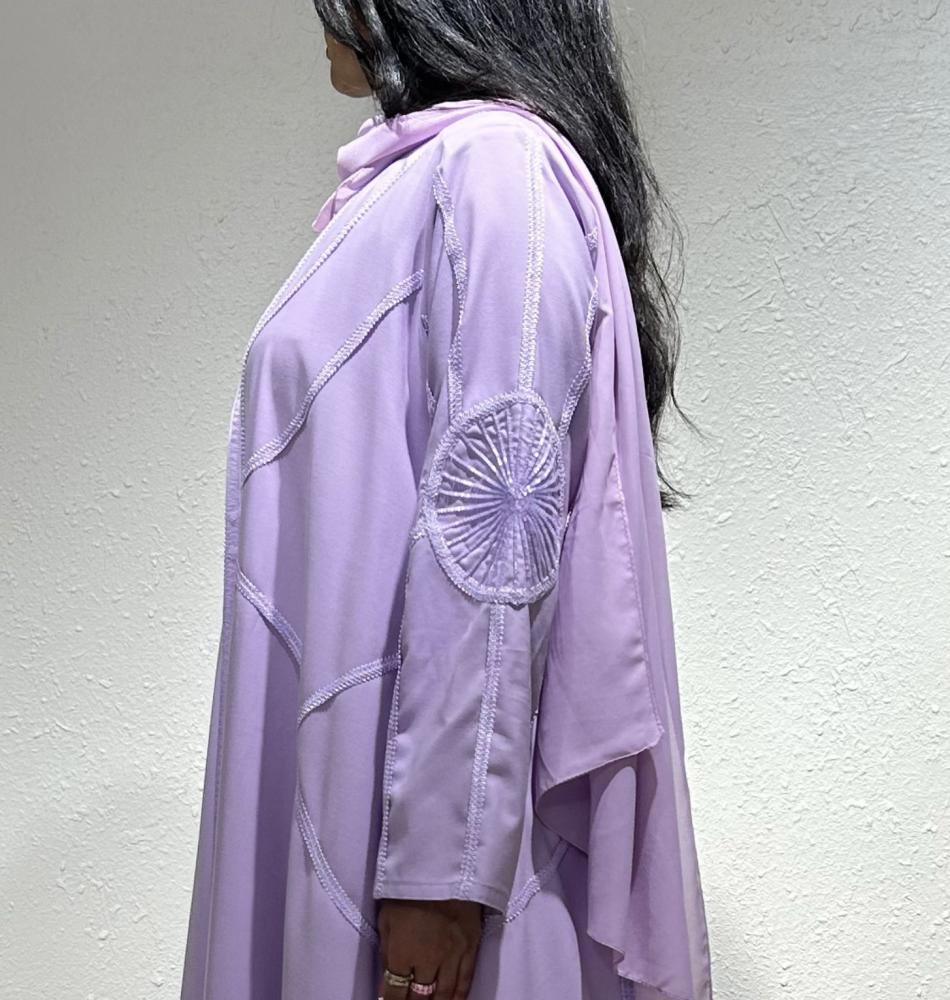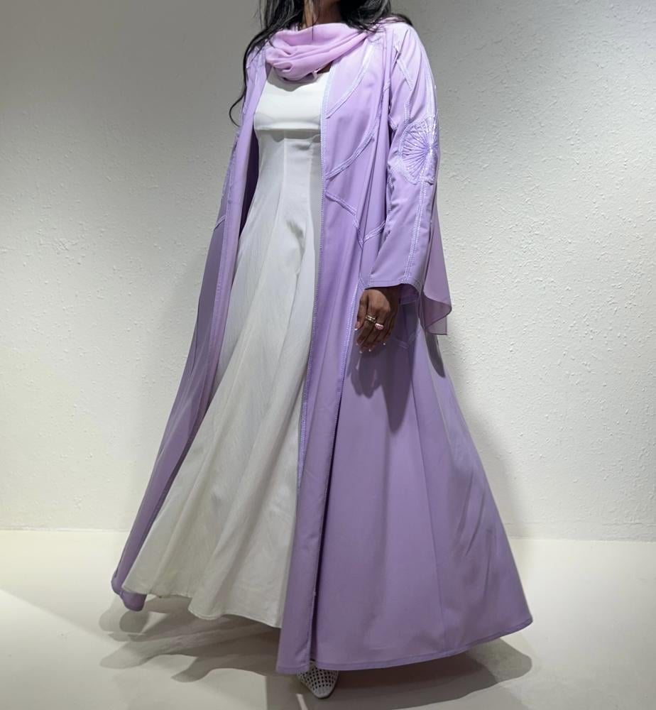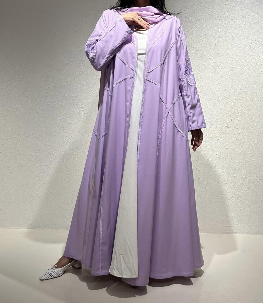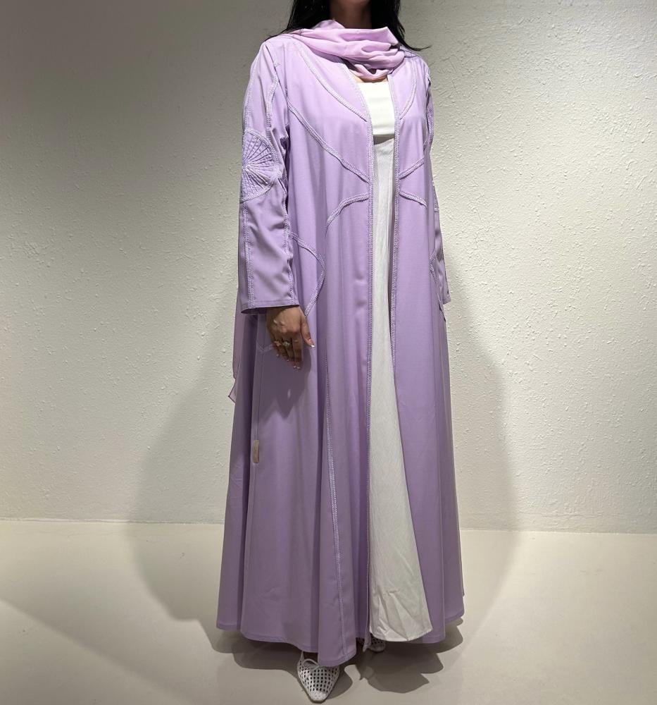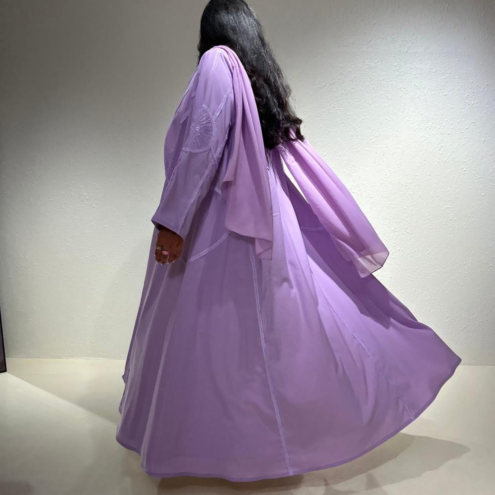 عباية صيفية بلون اللافندر البارد مصنوعة من قماش الكريب الايطالي الخفيف تتميز بكتافات خفيفة جدًا وشك أنيق على الأكمام بنفس اللون، مع تطريز عشوائي أنيق من الأمام والخلف يضيف لمسة فنية مميزة.