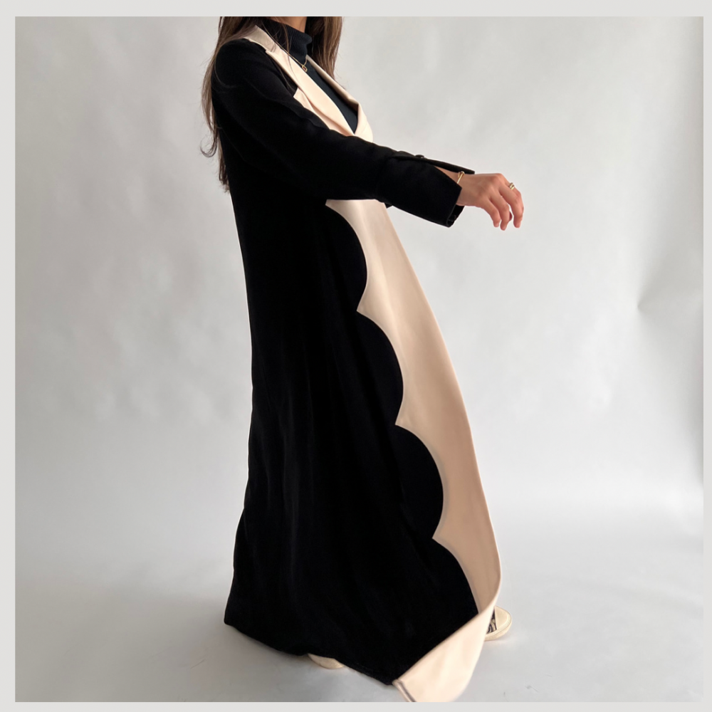 عباية بقماش الكريب بقصة الجاكيت الأنيقة التي تلائم المناسبات والاجتماعات بالإضافة الى تدخيله من الأمام باللون السكري تعكس الفخامة وتضيف إليها مظهر أكثر من راقي.