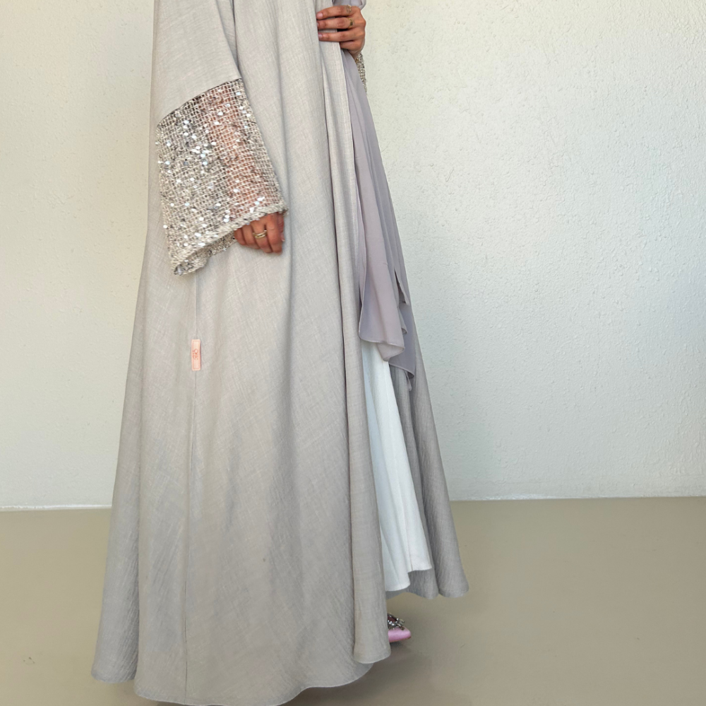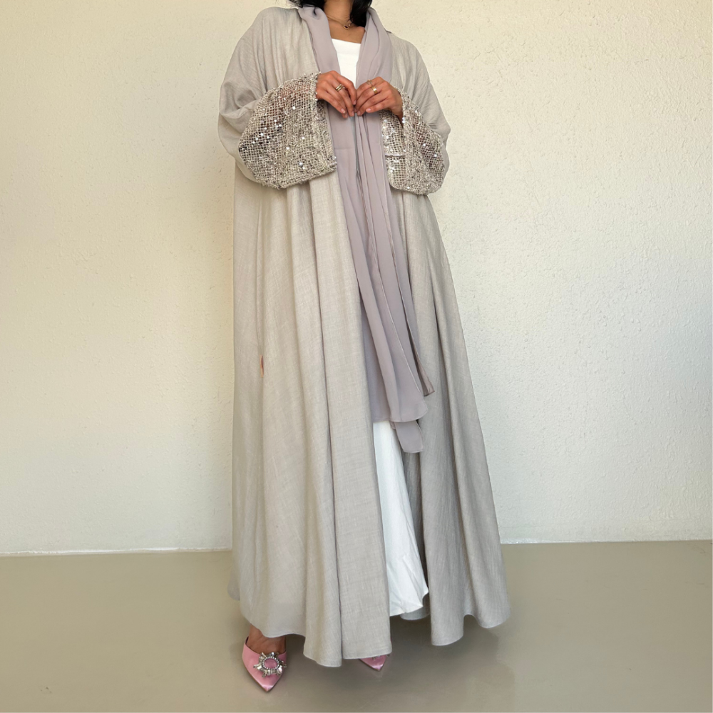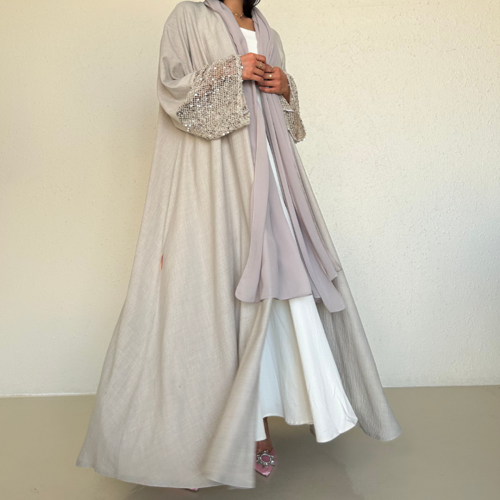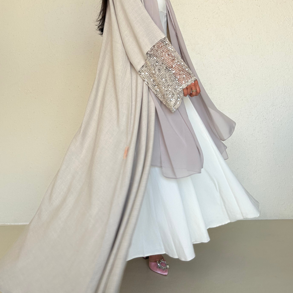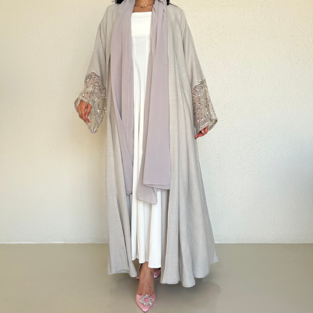 عباية صيفية فاخرة مصنوعة من قماش اللينين الخفيف، تجمع بين الأناقة والراحة في كل تفصيلة. مزينة يقماش الخيش يزين الأكمام ليضيف لمسة أنثوية ساحرة لا تقاوم. تأتي مع طرحة بنفس الأناقة لتمنحك طقمًا متكاملاً يعكس ذوقك الرفيع.