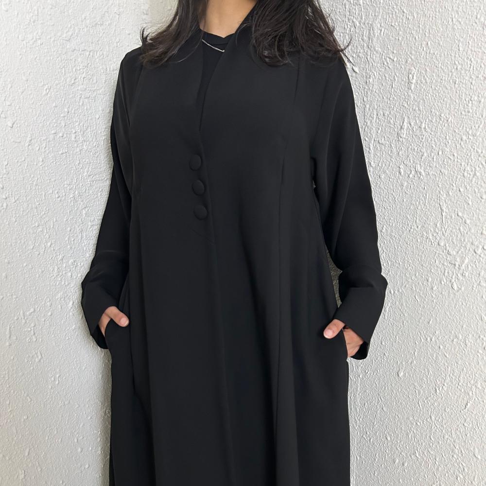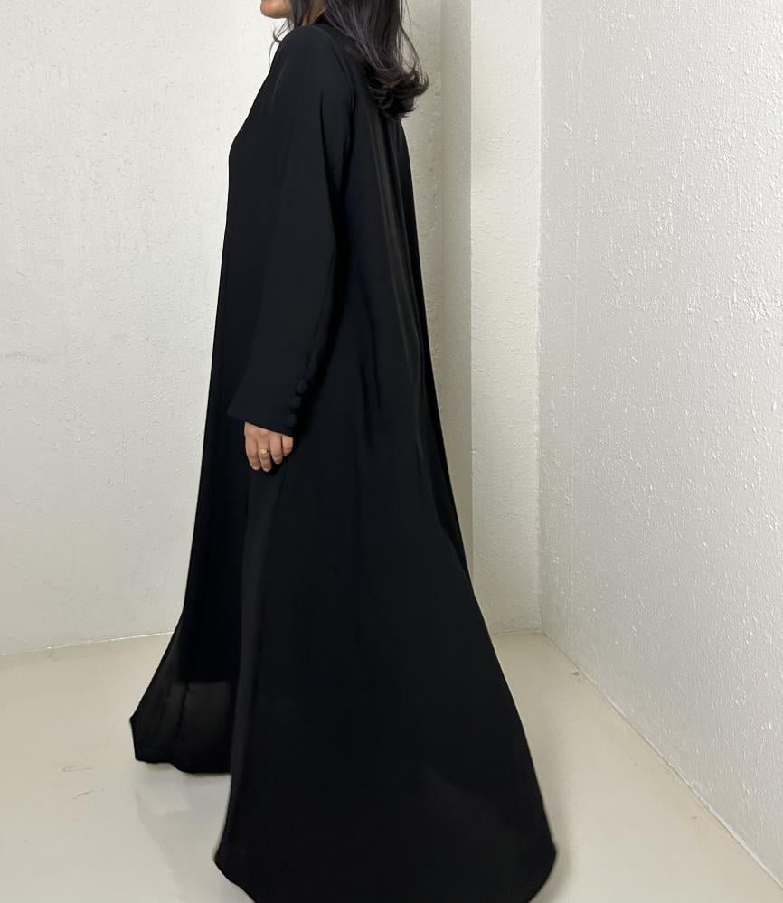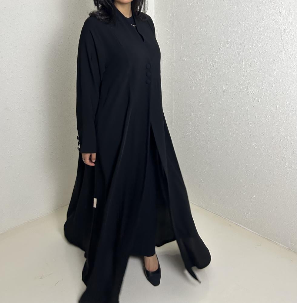 عباية كريب إيطالي أسود بقصة A، تجمع بين البساطة والأناقة وتناسب . تتميز بتصميم واسع ومريح، مع اماكنية اغلاق العباية و جيوب جانبية عملية، وتأتي مع طرحة بنفس اللون لإطلالة متكاملة.